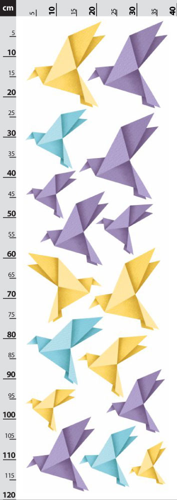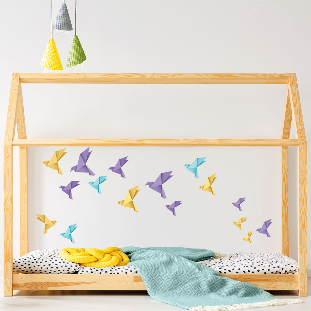 Origami ptáčci - fialové, žlté a modré - nálepky na zeď